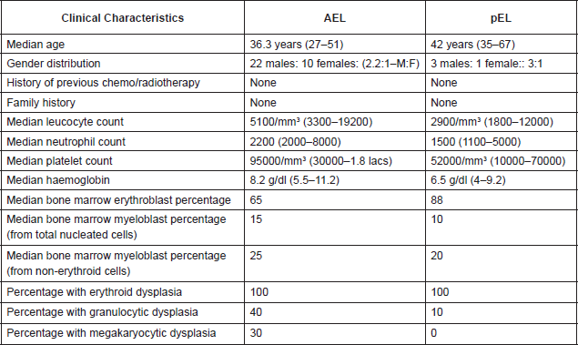 Results: The most common presenting symptom was fever. Pancytopenia at presentation was seen in 81.25% of patients. Dysplasia was observed in bone marrow in 100% of erythroblasts and in 40% of myeloblasts in erythroid/myeloid subtype. In pure myeloid subtype, myeloid and megakaryocytic dysplasias were not obvious. Complex karyotype was noticed only in patients of pEL.