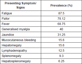 The most common presenting symptom was fever seen in 22(68.75%) patients, whereas the most common symptom present was easy fatiguability seen in 28(87.5%) patients. Other prominent presenting symptoms were mild mucocutaneous bleeding seen in 5(15.6%) patients and lymphadenopathy seen in 4(12.5%) patients. Signs on examination were pallor in 25(78.12%) patients, jaundice in 10(31.25%) patients and organomegaly in 10(31.25%) patients: hepatosplenomegaly in 2(6.25%), only hepatomegaly in 5(15.62%) and only splenomegaly in 3(9.3%) patients. Most patients had an ECOG PS of 2. At presentation, most of them required blood/component transfusions. Mean total bilirubin was 2.7 g/dl (0.8–4.7) (Table 2).