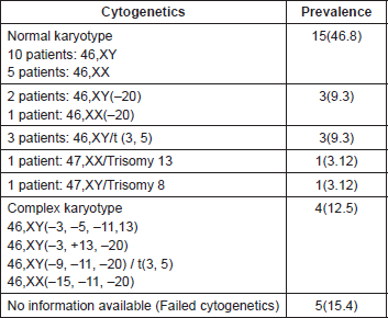 32 AEL patients were diagnosed in this period in 19 years of which 28 were of myeloid/erythroid subtype (erythroleukemia-M6a) and 4 were of pure erythroid subtype (pEL-M6b). Of these patients, 22(68.75%) were males and 10(31.25%) were females. In the group of patients with pEL, three were males and only one was a female patient. Median age was 36.3 years (Table 1).
