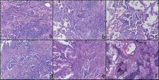 Figure 1. Histological features of the six tumours included in this study. Representative micrographs of the six tumours showing adenocarcinoma with a prevalent lepidic and/or acinar growth pattern (a-f) with focal formation of micropapillae in case 3 (c) and solid nests in case 6 (f). Haematoxylin and eosin-stained slides; original magnification 200x.