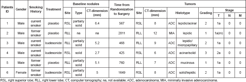 Table 1. Clinico-pathologic features of baseline nodules and tumors of the six patients who developed lung adenocarcinoma.