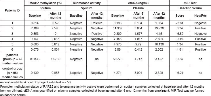 No significant differences were observed in plasma cfDNA or sputum biomarkers between patients who developed NSCLC and the whole trial cohort (Table 2). The epigenetic analysis revealed p16INK4A or RASSF1a methylation in 16 samples and none from patients who developed lung cancer.