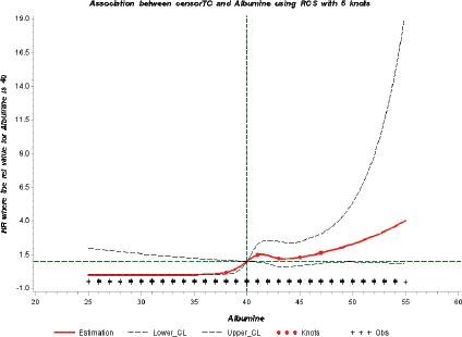 For those biomarkers where we observed an association based on the hazard ratios, we used the restrictive cubic spline (RCS) function to graphically display the hazard ratios representing the dose–response association. We used knots located at the 5th, 25th, 75th, and 95th percentiles as well as the medical reference value [19] in a multivariate Cox proportional hazards model as described above. This analysis was performed using the RCS_Reg SAS Macro created by Desquilbet and Mariotti [20]. All analyses were conducted with Statistical Analysis Systems (SAS) software release 9.4 (SAS Institute, Cary, NC) [21].