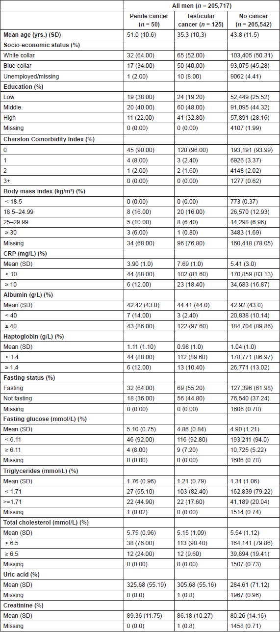 We restricted our study population to individuals aged 20 years or older who did not have a previous diagnosis of cancer. Furthermore, all subjects were required to have baseline measurements of CRP, albumin, haptoglobin available from the same health examination (n = 205,717). The outcome investigated in this study was penile cancer (International Classification of Diseases (ICD), Revision 7 (1955) code 179) and testicular cancers (ICD Revision 7 (1955) code 178) [13].