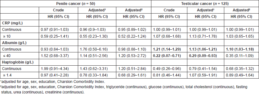 Materials and methods: A total of 205,717 subjects had baseline measurements of C-reactive protein, albumin, and haptoglobin. The association between quartiles and dichotomised values of inflammatory markers and penile and testicular cancer risk were analysed by using multivariate Cox proportional hazard models.