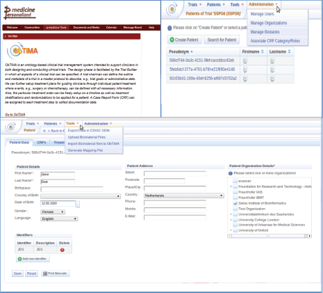 Figure 1. A short description of the functionality of the clinical tool ObTiMA as it can be seen from the portal (upper left corner) and from the test server (upper right corner and bottom panel).