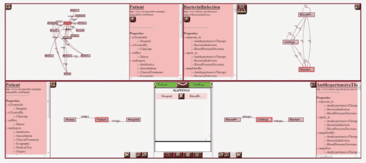 Figure 2. A screenshot of the Ontology Annotator. The tool includes several canvases for graphically representing both the schema of the database to align, HDOT, and the mappings between views from both models.