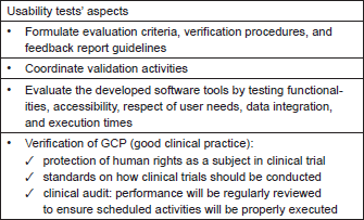 Regulatory authorities expect the management at an investigator site to be in control of all computerised systems, devices, and instruments associated with the delivery of patient care [19]. If data from these systems are used as source data for the CRF, then these data are classified as GCP data. The software that collects and processes patient data and the platform system that allows the software application to work are then considered to be GCP systems and are subject to system validation. In this sense, ObTiMA as well as the OA are GCP systems and should undergo system validation. Figure 5 illustrates the usability evaluation process for tools that involve the use and/or management of clinical trials data.
