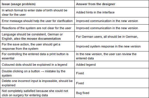 All unexpected reactions of the system or system failures have been denoted as so-called ‘critical incidents’ which are described in column three and recommended in column four of a use scenario. Important is the ‘thinking aloud’ method of the user during execution of the task, where continuous commentary by the user and reporting of all feelings when working are essential to get feedback on the way the user was working. The user should have a basic comprehension in the use of computers but he/she should not be familiar with the software in order to detect initial usage problems of the software. The problems that occurred were very similar regarding their interaction with the tool, so that we evaluate them together regarding the dialogue principles [12].