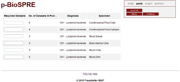 Figure 3. p-BioSPRE pool list. Upon ‘continue’, the pools selected by requesting a number of cases (‘Required Datasets’, left column) are automatically inserted into the Project Request Form (Figure 4). Note that pools shown in this screenshot are small since to date only 50 datasets have been imported into p-BioSPRE. Display of minimum number of datasets in a pool can be set by default (see