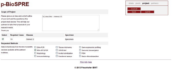 A registered researcher is enabled to search for and request biomaterial that is available within his research communities. He can access information about data linked to biomaterial and the number of available cases (a case (‘psn’ in Table 2) is defined as the data belonging to a specific disease of a donor/patient) backed by specimens. The p-BioSPRE web portal enables researchers to define a search profile according to the classification and annotations stored in the underlying database. The result of queries is presented as statistical groups, based on a k-anonymised view on the data. The project portal allows selection of statistical groups from the search result. Researchers are then requested to describe the scope of the envisioned project and can specify additional services (e.g., polymerase chain reaction, immunohistochemistry, fluorescence in situ hybridisation; see Figure 4, ‘Requested Methods’). Upon submission of the project request, the providing hospital or consortium will be displayed.