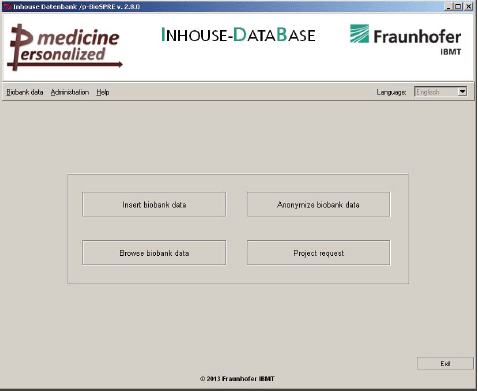 Figure 5. p-Biobank wrapper user interface: management of IDB. Functionalities of buttons are as follows: 1) insert biobank data: select and import a data file; 2) anonymise biobank data: deidentify data and create a file ready for export to p-BioSPRE; 3) browse biobank data: View cases (e.g., to restrict export); and 4) project request: execute a project request (file) and retrieve cases matching the request.