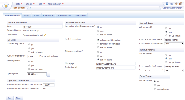 Furthermore, the user can list the members of the biobank committee. It is possible to assign biobanks to trials in order to enable collection of biomaterial for the biobank in different trials. In ObTiMA, specimens are created in trials to simplify the integration with the clinical data collected in the trial. A specimen that is created in a trial can be assigned to a specific biobank, but only if the biobank has been previously assigned to the trial. The assignment of the biobank to the trial needs to be confirmed by the trial chairman.