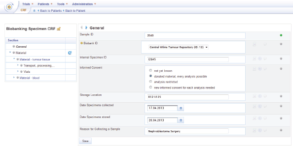 The International Society of Paediatric Oncology (SIOP) [4] is responsible for conducting successive international multicentric Wilms tumour trials across Europe. Within these trials, biomaterial is collected in different participating hospitals and sent to a central national biorepository, where the material is stored and further analysed. Related biomaterial data are also stored at the central biorepository.