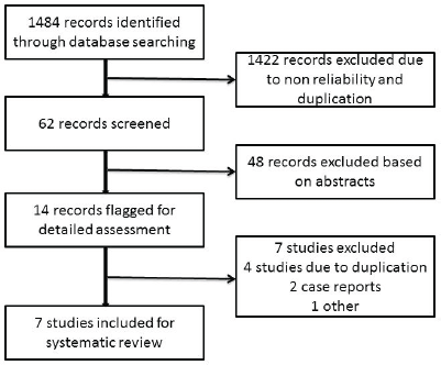 After a literature search, 1484 records were obtained, of which 1422 records were excluded initially because of non-reliability and duplication (Figure 1). Of the available 62 records, 49 records were excluded based on the abstract. The full manuscripts of 13 articles were reviewed by the authors. Three of these were found to be continuations of previous studies [6, 7, 10], two were case reports [12, 15], and in one study, we could not get the complete details of the subjects in the study [14]. We reviewed seven eligible studies for the analysis as per the inclusion criteria. A total of 352 patients with advanced GCTs underwent primary chemotherapy followed by delayed orchiectomy. All of the studies used platin-based chemotherapy. The number of cycles given prior to orchiectomy varied in different studies. Histopathological examination of the delayed orchiectomy specimens revealed viable tumour in 21% of patients, scarring/necrosis in 48.5%, and teratoma in 30.3%. Among these 352 patients, 235 patients underwent RPLND (Table 1). We were not able to retrieve the data of the remaining 117 patients (even after an attempt to contact the authors) to find out the reason for not performing RPLND. Among 235 patients who underwent RPLND, 15.3% had residual disease, 42.5% had scarring/necrosis, and 42.2% had teratoma (Table 1).