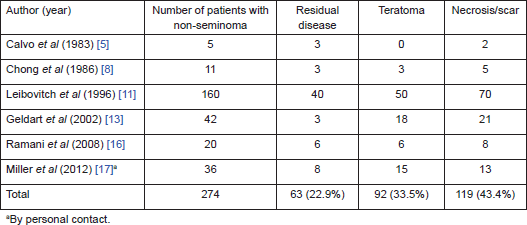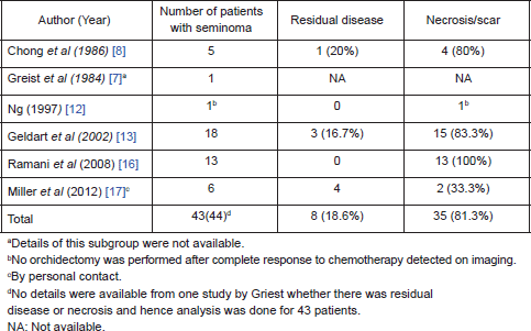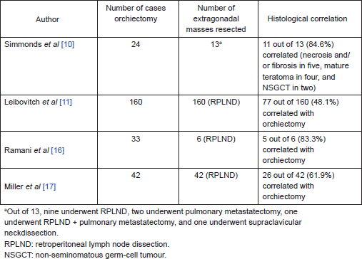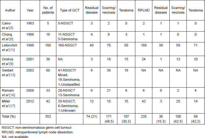 Hence, in this review, we would like to assess the response rates at the primary and secondary sites in patients with advanced GCT after initial chemotherapy. We would also like to review the literature on the final histological findings in patients who underwent delayed orchiectomy and RPLND.