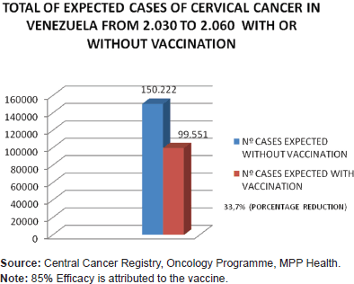Figure 10. Total expected cases of uterine cancer in Venezuela from 2030 to 2060 with or without vaccination. Number of cases without vaccination. Number of cases with vaccination. 33.7% reduction.