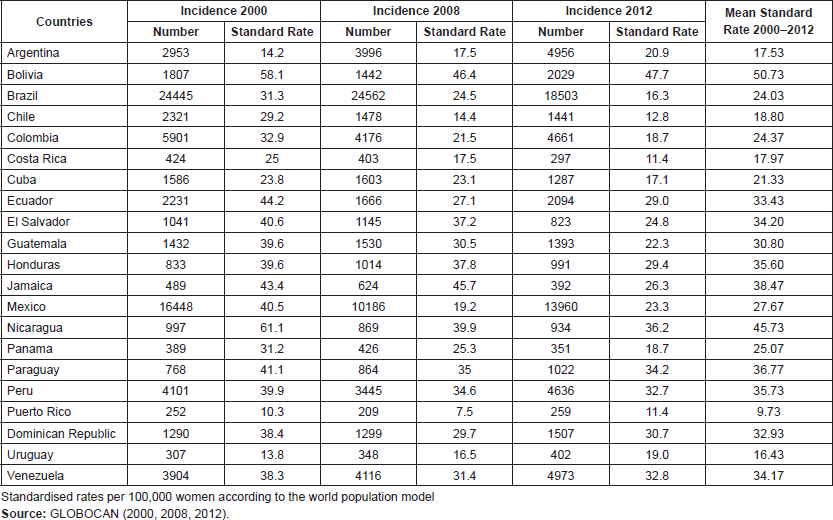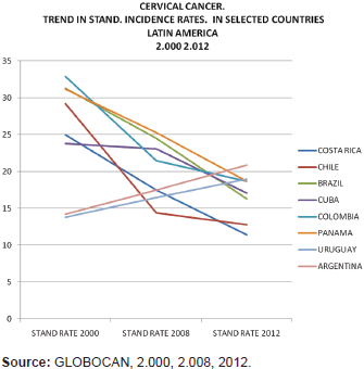 The incidence of cervical cancer in Latin America shows a tendency over time very similar to mortality; a marked variation can be seen between countries in Table 1 and Figure 3.