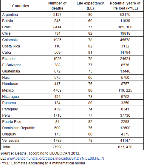 Table 3. Cervical cancer in Latin America. Potential years of life lost in 2012.
