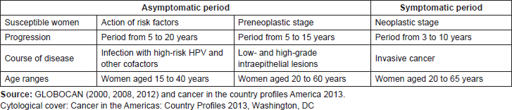 The natural history of cervical cancer has been recognised in the last four to five decades, without there have been major changes beyond differences in the nomenclature of precancerous lesions or the identification of the HPV as the necessary agent, but not sufficiently to have developed and evolved into a malignant neoplasm. The importance of understanding the natural history of this pathology is in its application to control measures. As can be shown in Table 4, pre-cancerous lesions can be detected 5 to 10 years before women become clinically symptomatic [11], thus identifying these lesions gives a good chance of arresting the development of the pathology.