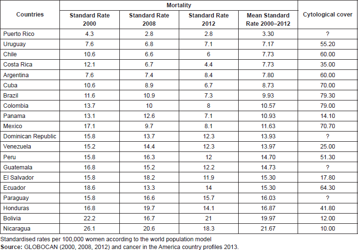 Table 5. Cervical cancer in Latin America. Correlation between mean mortality rate and cytological cover (2000, 2008, 2012).