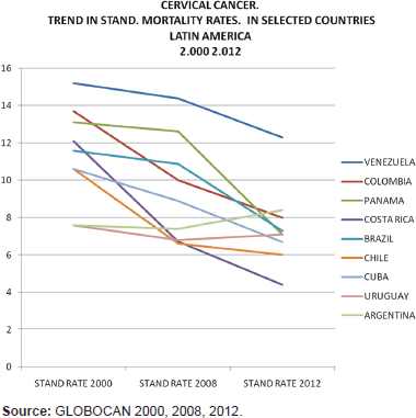 Figure 4. Cervical cancer trend in standard mortality rate from 2000 to 2012 in Latin America. Standard mortality rates X 100,000 women.