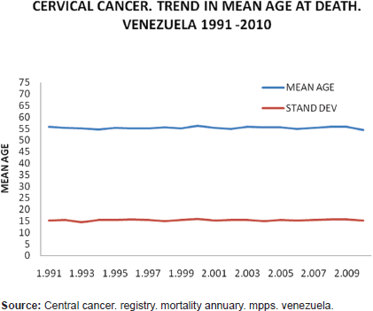 Figure 6. Cervical cancer. Trend in mean age at death. Venezuela 1991–2010. Mean age.