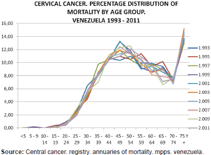 Figure 7. Cervical cancer. Percentage distribution of mortality by age group 1993–2010.