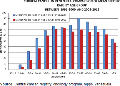Figure 8. Cervical cancer in Venezuela. Comparison of specific rates by mean ages 1991–2000 versus 2001–2010. Specific rates by age groups.