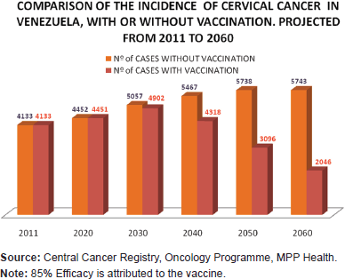 Figure 9. Comparison of the incidence of cervical cancer in Venezuela, with or without vaccination projected from 2011 to 2060. Number of cases without vaccination. Number of cases with vaccination.