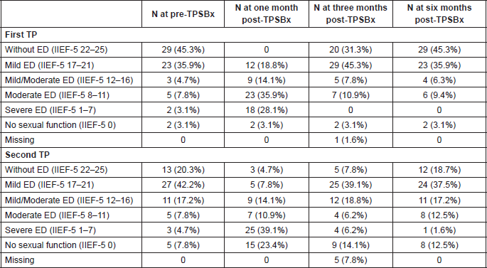 Of those men with normal erectile function before the initial TPSBx (IIEF-5 22-25), three out of 29 (10%) reported significant deterioration in their erectile function (IIEF-5 <17) six months post-second TPSBx.