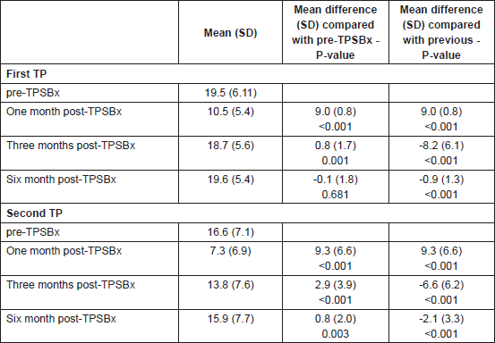 With the first TPSBx, there was a statistically significant difference between the IIEF-5 score pre-TPSBx and one month post-TPSBx (Table 3, P <0.001). Moreover, there was a statistically significant difference in IIEF-5 score between pre-TPSBx and three months post-TPSBx (P = 0.001). At six months post-TPSBx, there was no statistically significant difference anymore with the IIEF-5 score pre-TPSBx (P = 0.681).