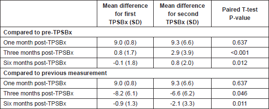 With the second TPSBx, there was a statistically significant difference between the IIEF-5 score pre-TPSBx and at one, three, and six months post-TPSBx (Table 3, P <0.05). There was a statistically significant difference in IIEF-5 score difference between the two biopsies, at three and six months post-TPSBx (Table 4, P <0.05).