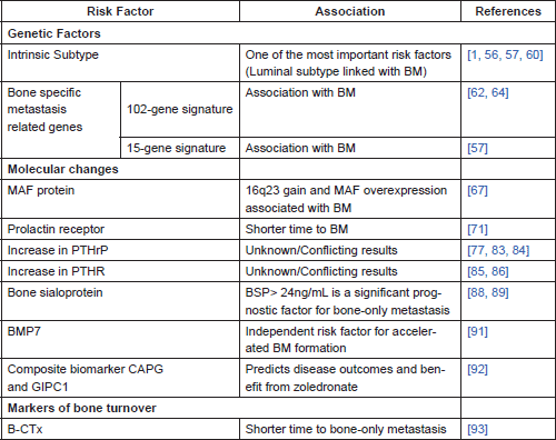 Recent access to large datasets of genetic information linked to clinicopathological and outcomes data, as well as the thriving study of cancer biomarkers, enabled the study of genetic associations with the pattern of metastases. Some of these factors are detailed in Table 2.