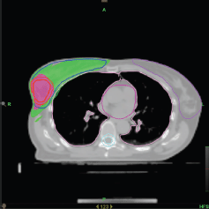 Figure 1. Axial view of a treatment plan for whole breast irradiation with SIB delivered with TomoTherapy. The colour green corresponds to 95% of the prescribed dose to the breast, and the colour red to 95% of the boost dose.