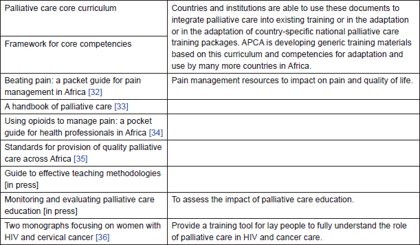 APCA has also supported the development of key documents to support palliative care education in Africa (see Table 1).