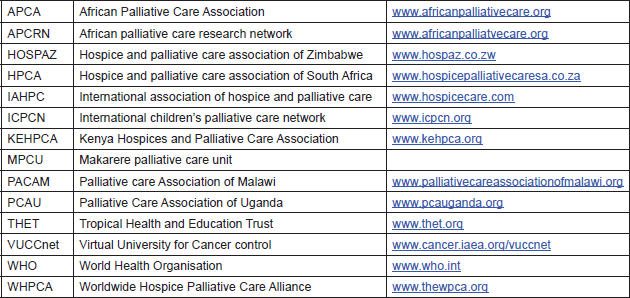 • National Associations, e.g., Kenya Hospices and Palliative Care Association (KEHPCA), Hospice and Palliative Care Association Of South Africa (HPCA), Palliative Care Association of Uganda (PCAU), Palliative Care Association of Malawi (PACAM)