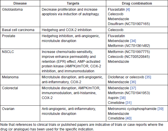 The following drugs warrant further investigation in combination with itraconazole (ITZ) and existing standard of care cancer treatments in a range of cancers. These combinations, listed in Table 1, have been selected on the basis of existing pre-clinical and clinical experience in each of the indications. In some cases these combinations replicate existing protocols currently being tested in clinical trials, but substitute known and repurposed drugs for the newer and/or more toxic agents currently being investigated. All of these proposed combinations are expected to display relatively low toxicity and use low cost and generally available agents. The following drugs are not listed in order of priority.