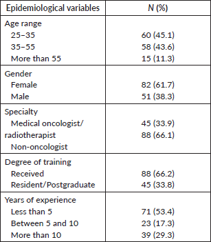 In terms of specialty, 33.9% identified themselves as medical oncologist or radiation oncologist, while 66.1% belonged to other specialties, as detailed in Table 2.