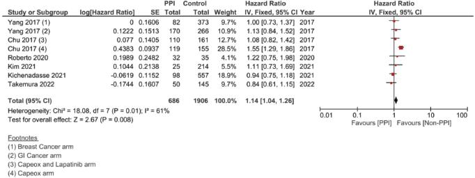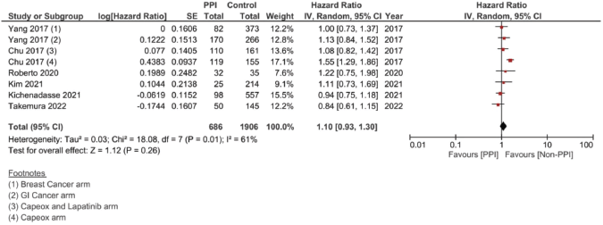 It is also worth mentioning that in Wang et al [18]’s study, which is later included in the meta-analysis of the effect of PPIs on the incidence of HFS, the authors reported additional information regarding the possible interaction between PPIs and capecitabine in the CapeOx arm and reported no significant differences in either the PFS (p = 0.52) or the OS (p = 0.98) – with no detailed data regarding the exact hazard ratios included. This study was not included in the qualitative or meta-analysis figures and was only included in the supplementary File 1 Table 1 provided.