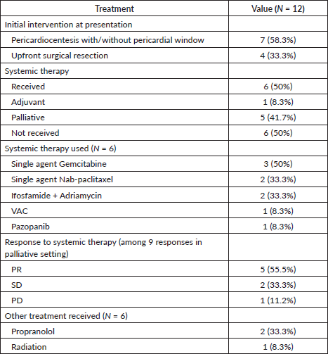 Results: A total of 12 patients were identified with primary cardiac sarcoma, with a median age at diagnosis of 33 years (IQR 20.5; range: 17–53). At presentation, 66.7% had pericardial effusion requiring pericardiocentesis with or without pleuropericardial window. Half (6 of 12 patients) were misdiagnosed initially as either tubercular pericardial effusion or cardiac hydatid cyst. Upfront resection was done for 4 patients (33.3%), while 4 (33.3%) had locally advanced/unresectable disease and the remaining 4 (33.3%) presented with de-novo metastatic disease. Angiosarcoma constituted 50% (6 out of 12), all arising from the right atrium. Of the 12 patients included, 6 received a median two lines of therapy. Of the total 9 response assessments (both as first line and subsequent lines), 55.5% had an objective response rate with an 88.8% clinical benefit rate. The median progression-free survival for first-line systemic therapy was 5.4 months. The median overall survival for patients who received systemic therapy and the entire cohort were 19.2 and 5.1 months, respectively.