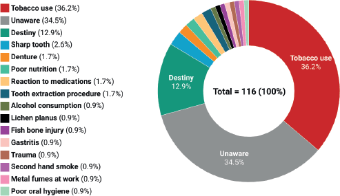 Only 1 (0.9%) participant was aware of free oral cancer screenings in government healthcare centers. All (100%) participants were unaware of self-examination for oral cancer and had never been referred for oral cancer screening to a healthcare facility. Only 9 (7.8%) were aware of the existence of laws governing tobacco production and sale in India. Most participants (97, 83.6%) had noticed warning signs on tobacco products, but only 44 (37.9%) expressed fear in response to these warnings. Only 42 (36.2%) participants attributed their cause of cancer to tobacco use (Figure 1).