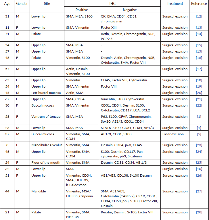 24. Ralli M, et al. (2019) Glomangiopericytoma-type glomus tumour/myopericytoma of the lip Br J Oral Maxillofac Surg 57 923–925 https://doi.org/10.1016/j.bjoms.2019.06.022 PMID: 31285072