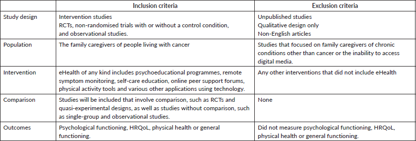 The eligibility criteria for this review will be determined using the Population, Intervention, Comparison, Outcome (PICO). framework. We will include studies that (a) are RCTs or non-randomised trials with or without a control condition or observational studies; (b) target unpaid family caregivers of cancer patients aged 18 years and older; (c) comprise eHealth interventions, such as psychoeducational programmes, remote symptom monitoring, self-care education, online peer support forums, physical activity tools and other technology-based applications; (d) report quantitative outcomes of family caregivers of cancer patients, such as psychological functioning, HRQoL, physical health and general functioning and (e) studies undertaken in English and other languages, published in countries designated by the United Nations as developing, characterised by low living standards, inadequate infrastructure and a predominantly non-industrialised economy [35] (Table 1).