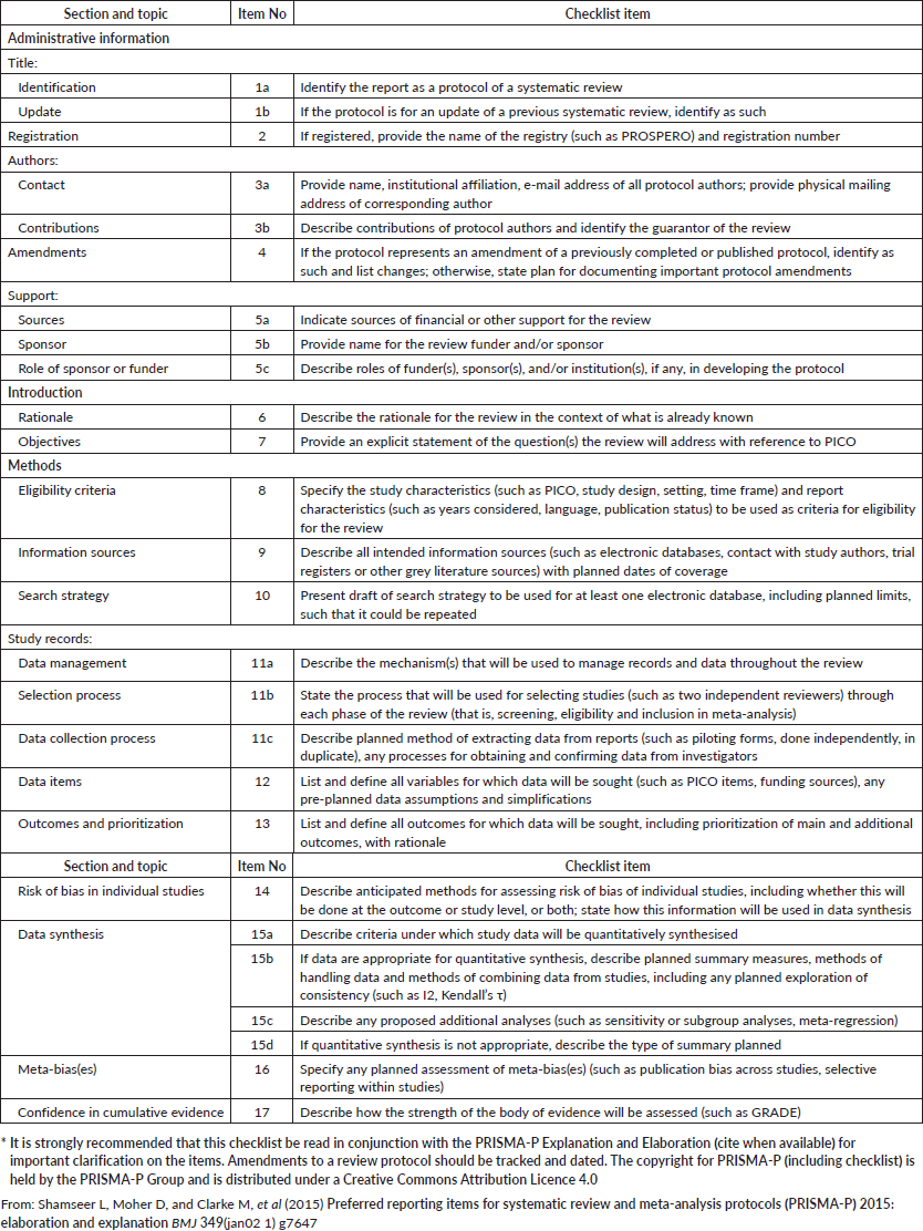 Supplementary file 1. PRISMA-P 2015 checklist: recommended items to address in a systematic review protocol*.