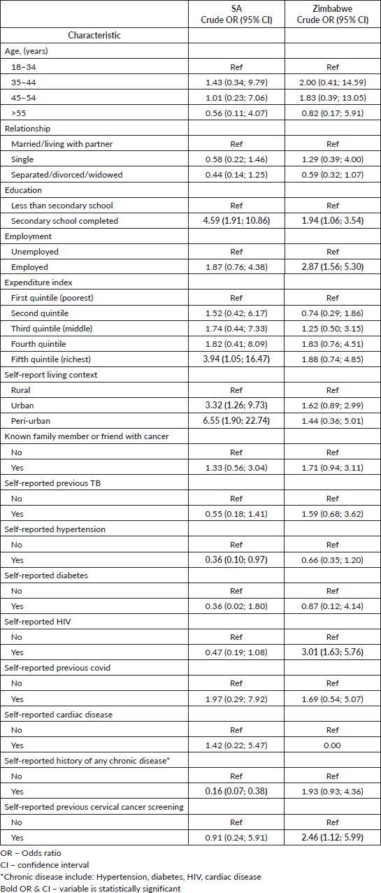 Table 2 describes cervical cancer symptom awareness stratified by country. 81% (n = 174) of participants in Zimbabwe and 19% (n = 55) of those in SA recalled at least one cervical cancer symptom. In SA, 35% of women who were able to recall at least one symptom had completed secondary school, compared to only 13% of those who were not able to recall any symptoms (p = < 0.001) (Table 2).