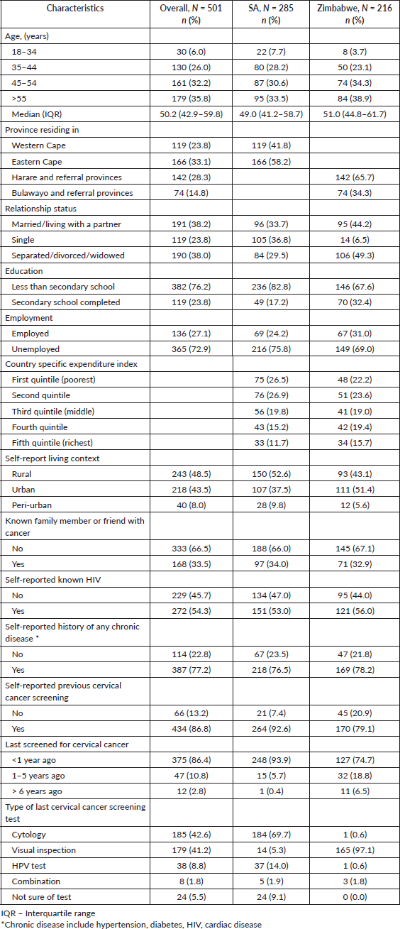 Overall, 501 women with cervical cancer participated in this study, 285 (57%) from SA and 216 (43%) from Zimbabwe (Table 1). The median age was similar in both countries (49.0 (IQR 41.2–58.7) in SA and 51.0 (IQR 44.8–61.7) in Zimbabwe, respectively).