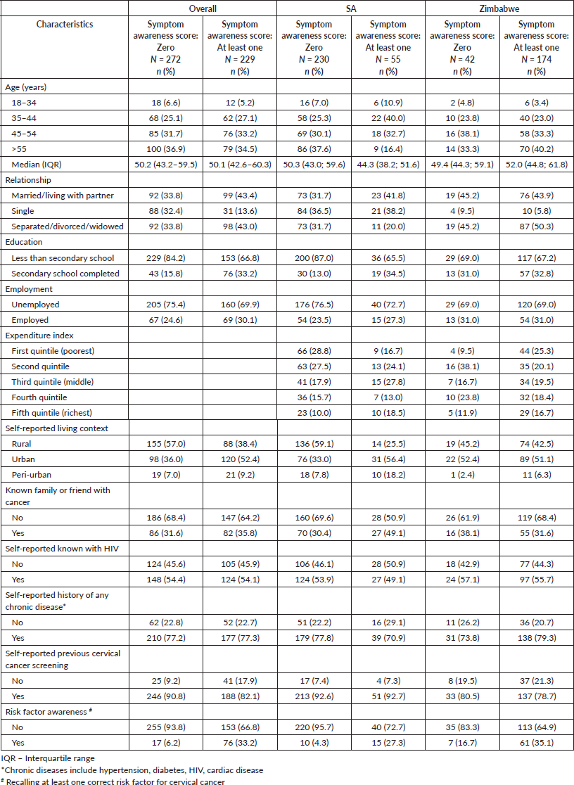levels of cervical cancer awareness, particularly among women in SA. For both symptom and risk factor awareness, a far higher proportion of women from Zimbabwe were able to recall at least one symptom or risk factor of cervical cancer compared to women from SA. Among South African women, the level of education and self-reported living context were associated with symptom awareness, while having a chronic condition was associated with less risk factor awareness. Among Zimbabwean women, the expenditure index was associated with symptom awareness, while self-reported HIV was associated with risk factor awareness.