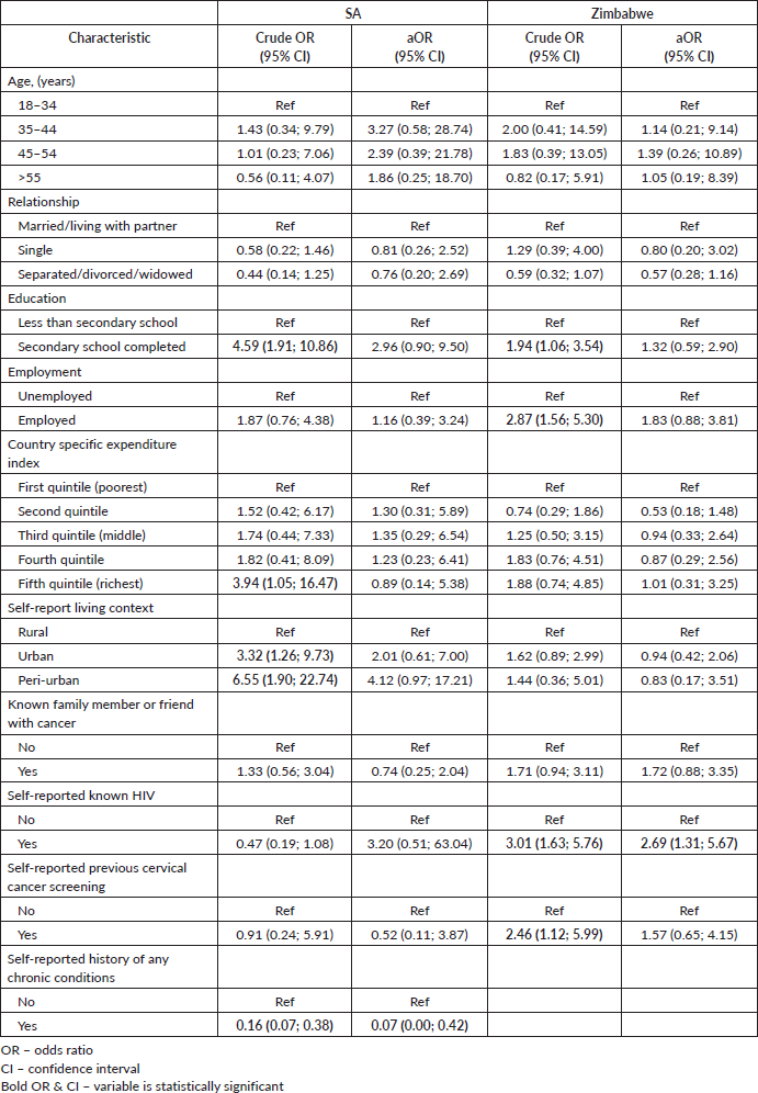 Among women in SA, level of education, self-reported living context, self-reported history of any chronic conditions and expenditure index were all associated with cervical cancer risk factor awareness in bivariate analysis (Table 5). However, in a multivariable logistic regression including these variables, having any self-reported chronic condition was the only factor that remained significantly associated with risk factor awareness (Table 5). Those who reported having a chronic condition were less likely to know at least one cervical cancer risk factor compared to those who reported not having any chronic conditions (aOR 0.07 95% CI 0.00–0.42). Among women in Zimbabwe, level of education, employment status, self-reported HIV status and self-reported previously screening for cervical cancer were associated with cervical cancer risk factor awareness in bivariate analysis (Table 5). Self-reported HIV status was the only factor that remained significantly associated in the multivariable model. Women who self-reported living with HIV were more likely to know at least one cervical cancer risk factor compared to those who reported not living with HIV (aOR 2.69 95% CI 1.31–5.67) (Table 5 and S4).