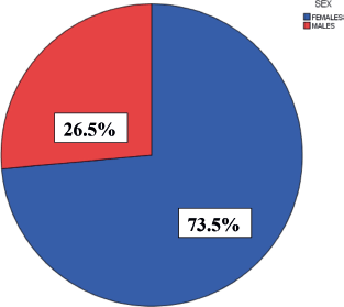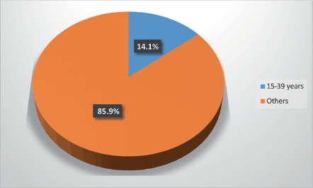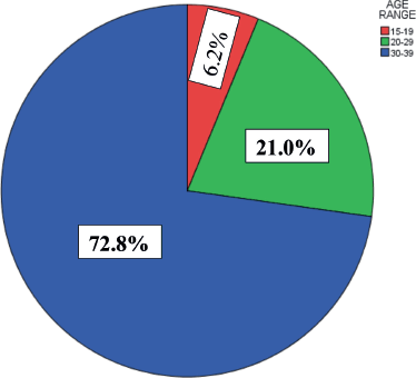 Among the AYAs, almost three-quarters (73.5%) were females, giving a male-to-female ratio (M:F) of 1:3. A large majority of them (72.8%) were within the age group 30–39 years (Figures 2 and 3), while their mean age was 32.06 ± 6.18 years. There was a statistically significant difference between the mean ages of males (29.43 ± 7.57 years) and females (33.01 ± 5.31 years) with p < 0.001 and there was a statistically significant association between age group and sex as the proportion of males within the age group 15–19 years (15.7%) was higher than that of the females (2.8%) and the proportion of females within the age group 30–39 years (78.1%) was higher than the proportion for males (57.9%) with p < 0.001 (Table 1).